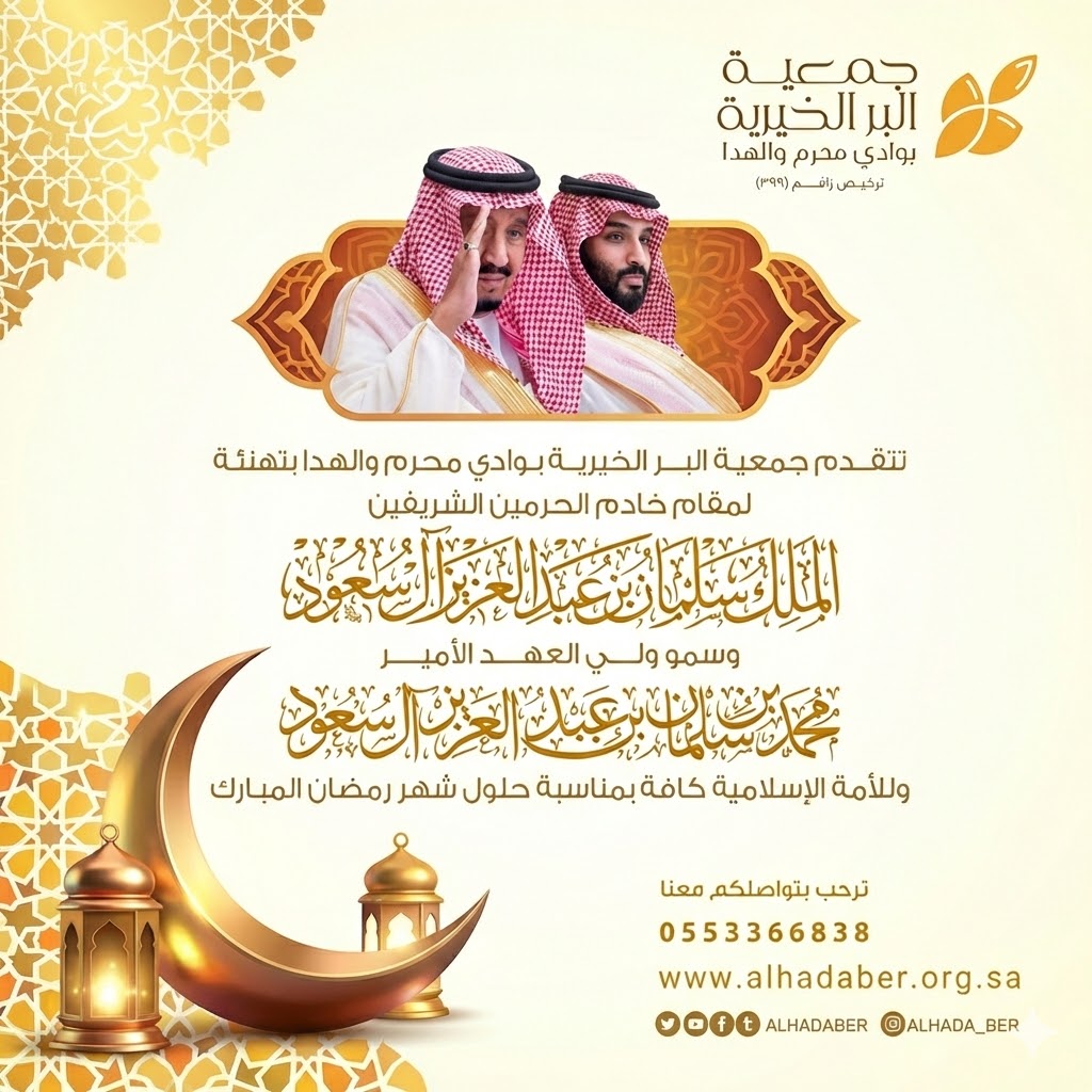 تتقدم جمعية البر الخيرية بوادي محرم والهدا متمثلة برئيس مجلس الادارة أ. طلال بن عبدالله الطويرقي وكافة منسوبيها بأجمل التهاني والتبريكات الى مقام خادم الخرمين الشريفين الملك / سلمان بن عبدالعزيز آل سعود حفظه الله ، وولي عهده الأمير / محمد بن سلمان آل سعود حفظه الله وللأمة الاسلامية والعربية بمناسبة حلول شهر رمضان المبارك اعاده الله علينا باليمن والبركات والعتق من النيران.